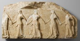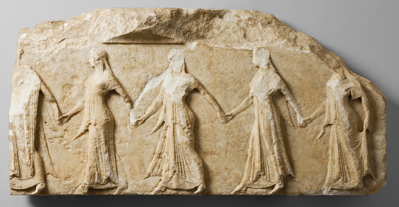 Показать сохранность, происхождение, литературулевая часть блока, левый и правый нижние углы утрачены; выступающая часть киматия оббита; верх фигур, за исключением второй слева, сбит; верх фимиатерия, изображенного на торце блока, сколот