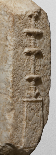 Для облегчения монтажа фриза составляющие его плиты должны были маркироваться. К такой разметке блоков, по всей вероятности, относится знак, вырезанный на поверхности рельефа С между фигурами III и IV, напоминающий букву греческого алфавита – «Λ». Буквенная маркировка известна в кладке портика Филиппа на Делосе, где блоки отсчитывались по горизонтальным рядам слева направо3. При следовании такому порядку на нашем рельефе «Λ», знак числа 11, обозначала бы одиннадцатый блок ряда.