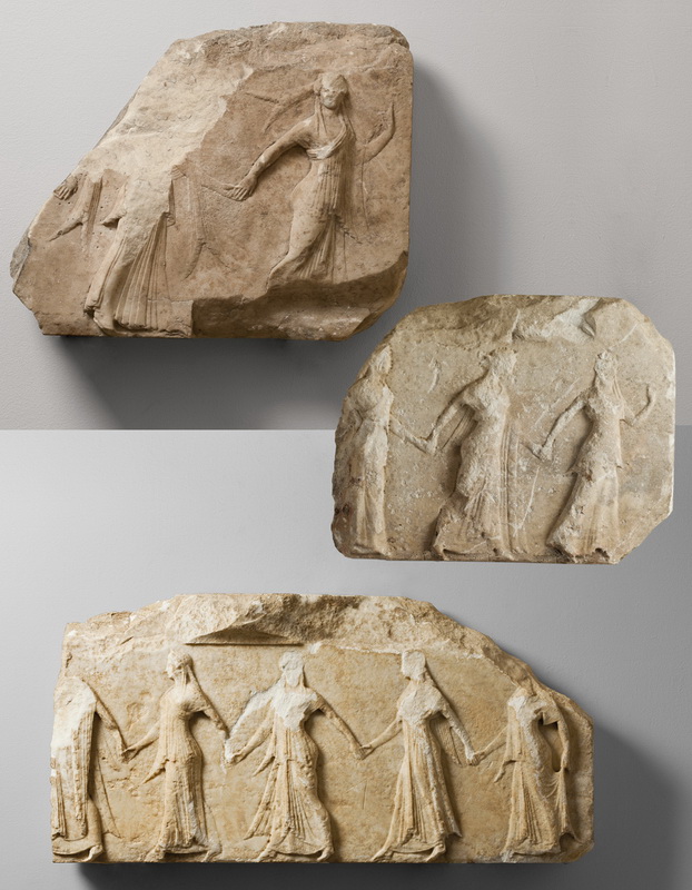 Скрыть отдельные предметыНа гладком поле плиты блока А, в низком рельефе сохранилось изображение двух женских фигур, идущих вправо взявшись за руки. За левой, последней из сохранившихся фигур, следовала еще одна, от которой осталась лишь кисть руки, держащая руку предыдущей нимфы. Девушки идут на полупальцах, выступая с левой ноги. Правая фигура возглавляет процессию. Одна рука ее свободна и поднята к развивающейся накидке (кредемнону), покрывающей головной убор типа пóлоса, длинные локоны спускаются на грудь. Лицо девушки показано анфас, бедра повернуты в профиль, верхняя часть торса имеет трехчетвертной разворот. Обе нимфы (или хариты) одеты в длинные хитоны и гиматии. На левой фигуре гиматий наброшен на плечи как шаль, у правой скручен и изящно перекинут через левое плечо, спускаясь до бедер. Фигуры выполнены в архаистическом стиле. Ткань одежд драпируется мелкими параллельными складками, концы покрывал, взлетающие как бы в безвоздушном пространстве, показаны в форме «ласточкиного хвоста», напоминающего сегмент зонтика1.