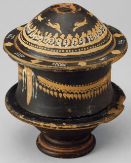 Наиболее сложным и разнообразным декором отличаются амфоры стиля «Западного склона». Но и среди небольших по размерам сосудов встречаются вазочки, украшенные с особой тщательностью и выдумкой. В их числе – маленькая пиксида в собрании Музея.