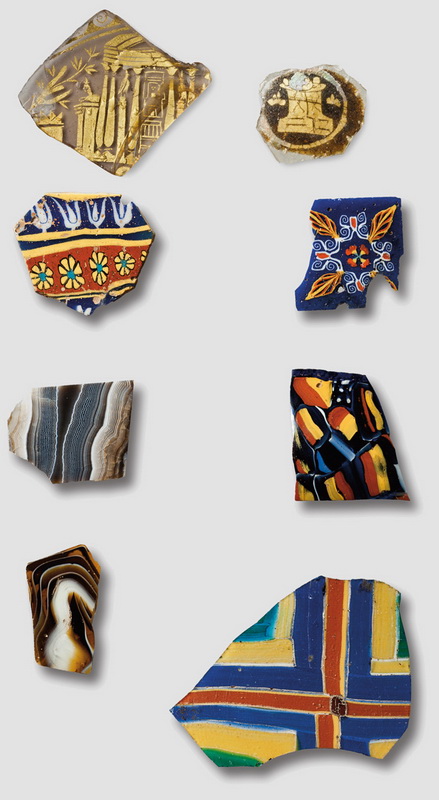 На одном из фрагментов мозаичной пластины (№ 116.3) уцелело два декоративных фриза: в первом розетты с зеленой сердцевиной и желтыми лепестками, окантованными темной узкой полоской, помещены на красном фоне, обрамленном с двух сторон двойной желтой «дорожкой»; второй фриз состоит из побегов белых лотосов на темно-синем фоне. На другом фрагменте (№116.4), темно-синего цвета, в центре помещена розетта из четырех красно-желтых бутонов, соединенных зелеными стеблями; она обрамлена орнаментом из четырех красно-желтых пальметт, дополненных по бокам парными белыми завитками; все детали рисунка объединены тонкой белой нитью. Помимо растительных мотивов широко использовались полосы разной длины и разного цвета, расположенные произвольно и дополненные точечными розетками (№ 116.5) или же, напротив, собранные в строгие геометрические орнаменты (№ 116.8). Мозаичная техника позволяла также имитировать и природные многослойные камни, например агат: по темному фону непрозрачного стекла проходят тонкие волнистые нити голубоватого, коричневого и белого цветов (№ 116.7), в коричневое стекло впущены белые матовые полосы различной ширины (№116.6) и т.д. Изготовленные в мозаичной технике пластины и сосуды были довольно дороги, тем не менее они пользовались большим спросом.