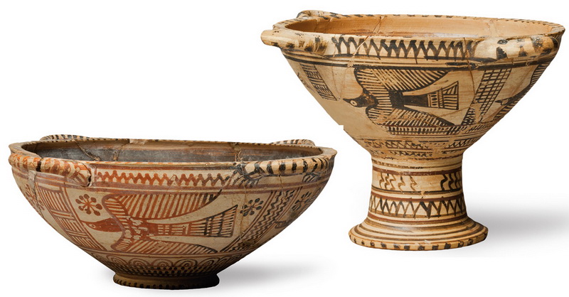 Две чаши из ГМИИ дают наглядное представление об особенностях этих ваз. Тулово каждой конусовидное, широкое вверху и заметно сужающееся книзу. Одна чаша возвышается на цилиндрической ножке, у второй невысокое кольцевидное основание. Четыре маленькие ручки прикреплены у края устья. Декор наружных сторон типичен для чаш этого класса: летящие птицы в клеймах, ограниченных полосами геометрического орнамента; вертикальные штрихи покрывают ручки, ряды зигзагов – край венчика и ножку высокой чаши, у низкой эти орнаменты дополнены растительными – розеттами на фоне и на обороте основания. Отличительная черта росписей подобных ваз – птицы изображены перевернутыми, обращенными спиной вниз. Внятного объяснения этому пока нет1.