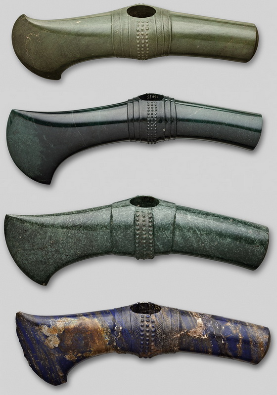 Топоры различаются размерами, весом, материалами, из которых они изготовлены, а также элементами отделки. Два из них – Аар 165 и Аар 167 – предположительно выполнены из нефритоида; один – Аар 166 – из жадеитита; и еще один – Аар 168 – из лазурита. Объединяет их высочайшее мастерство троянских резчиков по камню, воплощенное в законченном совершенстве форм, и профессиональный уровень обработки поверхностей этих топоров-символов, которые с полным основанием можно отнести к подлинным шедеврам камнерезного искусства эпохи бронзы.